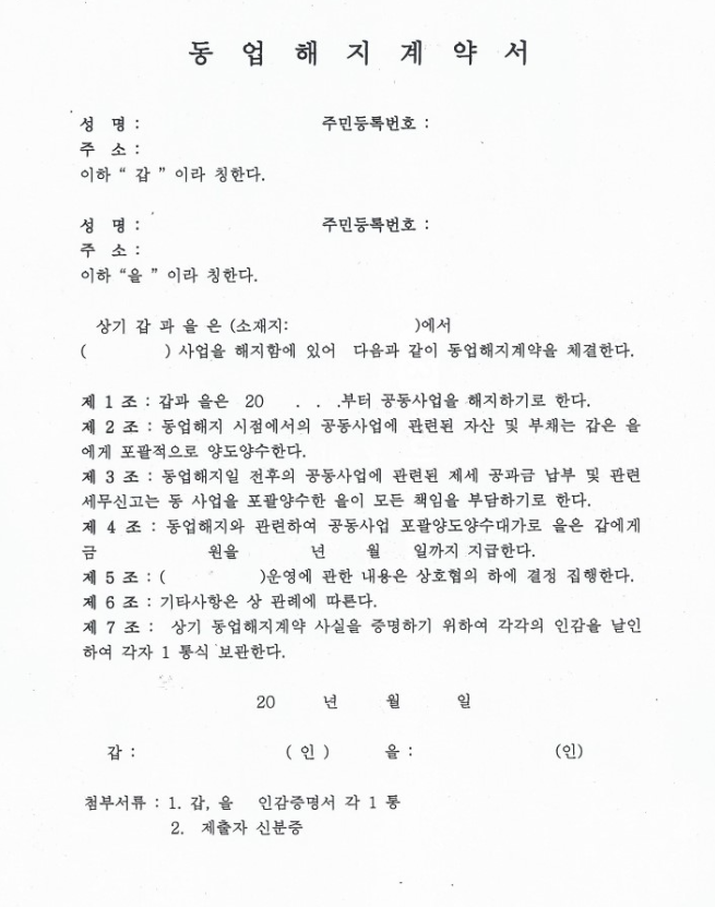 동업계약서, 동업해지계약서 입니다.